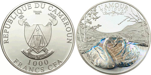 Республика Камерун в 2011 году представила оригинальную монету с голографической вставкой «Любовь навсегда» (L’Amour toujours). Лебединые пары, однажды встретившись, никогда уже не расстаются, поэтому лебеди символ любви и верности на всю жизнь, о такой преданности друг другу людям остаётся только мечтать.